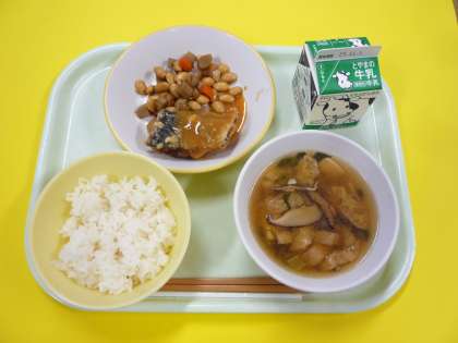 本日の献立は、ごはん、牛乳、魚の甘みそかけ、五目煮豆、うすくず汁です。