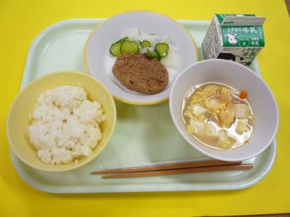 本日の献立は、ごはん、牛乳、和風ハンバーグ、かぶのサラダ、卵と豆腐のスープです。