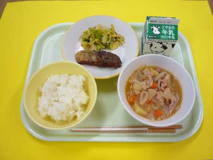 本日の献立は、ごはん、牛乳、魚の竜田揚げ、おひたし、豚肉の南蛮煮です。