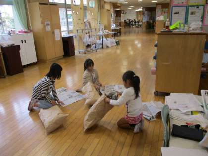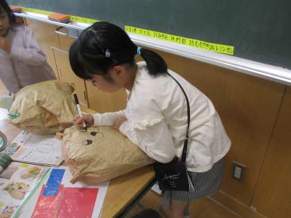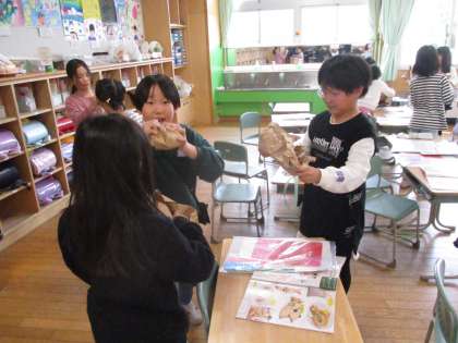 2年生は、図工で「くしゃくしゃぎゅ」を行いました。紙をくしゃくしゃにして、やわらかくしたり袋の中に入れたりしました。袋をぎゅっとしたら、とても気持ちよさそうでした。