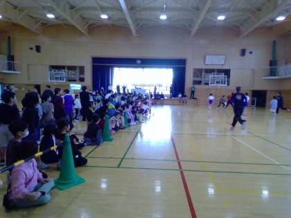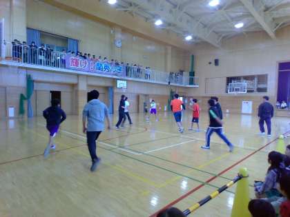 ハッピータイムには「先生対蘭州っ子」のバスケットボール大会が行われました。見ている子供たちは、シュートが決まるたびに歓声をあげて盛り上がっていました。