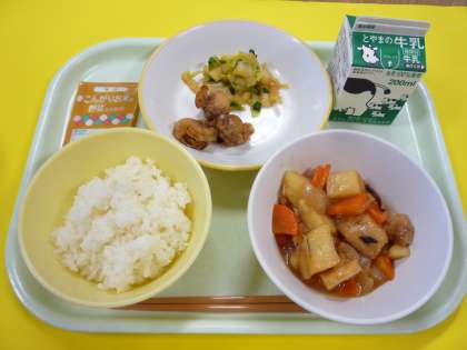 本日の献立は、ごはん、牛乳、ホタテの香味焼き、生姜びたし、酢豚、やさいふりかけです。