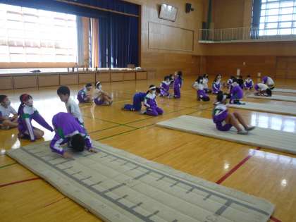 スポーツ指導員の方に、マット運動を指導していただきました。丁寧に分かりやすく教えていただき、子供たちから「後転ができるようになった」「側転のコツが分かった」と喜びの声があがっていました。
