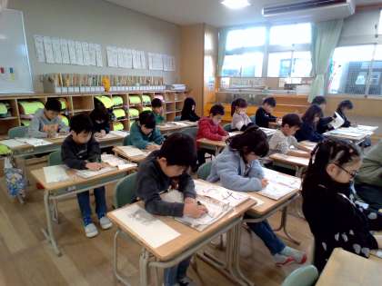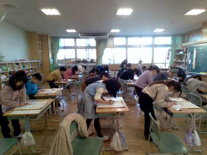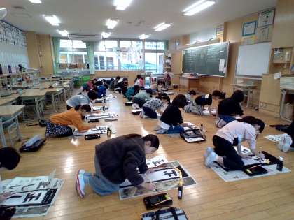 始業式のあとには、校内書き初め大会を行いました。蘭州っ子全員、真剣に取り組んでいました。