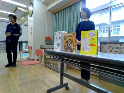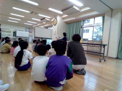 毎月第2水曜日は読み聞かせの会を開いています。今日は、文字のない絵だけの本等の3冊の本を紹介していただき、約50名の子供たちが参加しました。