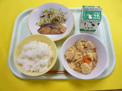 本日の献立は、ごはん、牛乳、ふくらぎの西京焼き、塩ナムル、厚揚げの錦とじです。