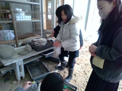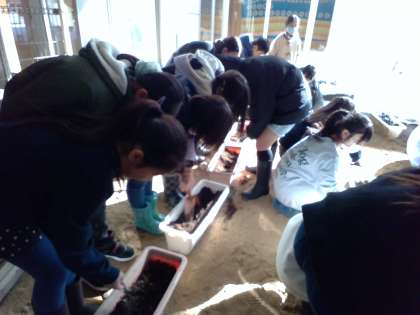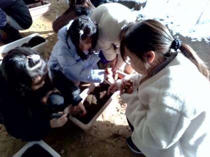 蘭秀タイムには、5年生が中庭生き物集会を行いました。参加してくれた人と一緒に、プランターに5色のチューリップを植えました。プランターは中庭に続く小道の両脇に並べられました。春にはチューリップ花が咲くフラワーロードになりそうです。