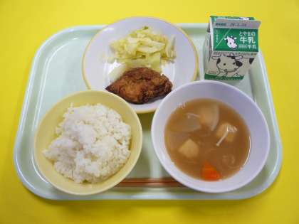 本日の献立は、ごはん、牛乳、魚のえごまだれ、茹でキャベツ、すいとんです。