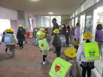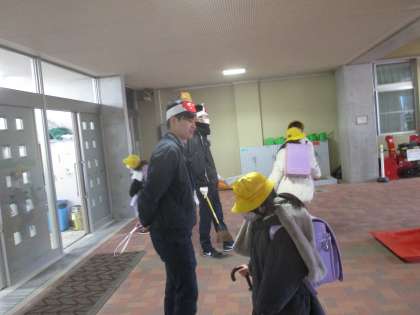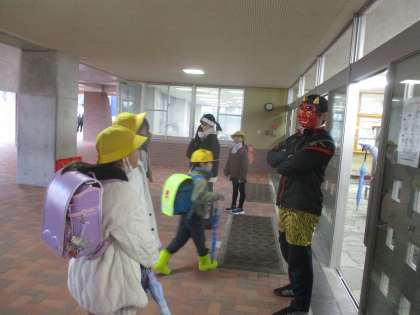 2月3日は節分です。一足早く山室小学校にも鬼が来ました。鬼たちにも元気に挨拶をしていく蘭秀っ子でした。