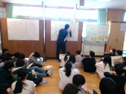 卒業式に歌う合唱曲の歌詞の意味について考えました。これまでの学校生活を振り返り、どんな思いを歌に込めるか学年で確認しました。