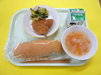 本日の献立は、コッペパン、牛乳、あじフライ、だいこんサラダ、マカロニスープ、棒チーズです。