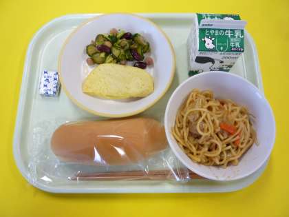 本日の献立は、減量コッペパン、牛乳、オムレツ、ビーンズサラダ、焼きそば、ポケットチーズです。