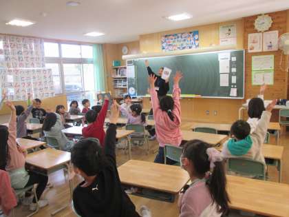 英語活動がありました。ALTが話される英語と日本語を真剣に聞きながら、食べ物の名前を声に出して練習したり、楽しくゲームをしたりしました。