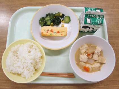 本日の献立はごはん、牛乳、千草焼き、コーン和え、鶏肉と大根のごますき煮です。