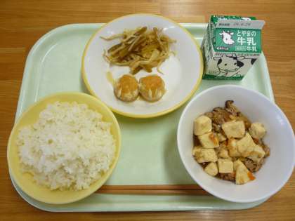 本日の献立は、ごはん、牛乳、にんじんシューマイ、茎わかめのチョナムル、マーボー豆腐です。