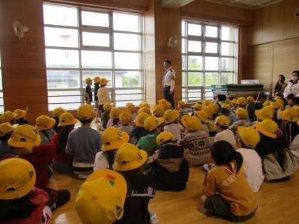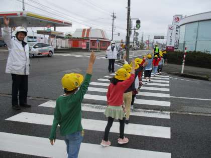 子供たちは、富山南警察署の方から、右・左・右を確かめて横断することや、信号機のある交差点では手を挙げて横断するなどの、交通安全についてのお話を聞きました。クラスの代表者は、警察署の方に向かって、交通安全の誓いを行いました。