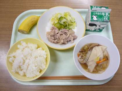 本日の献立は、ごはん、牛乳、豚肉の塩こうじ炒め、きざみ和え、ワンタンスープ、バナナです。