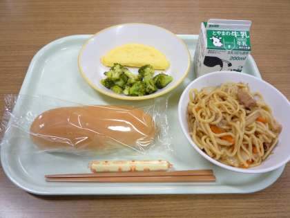本日の献立は、減量コッペパン、牛乳、オムレツ、ドレッシングサラダ、焼きそば、棒チーズです。