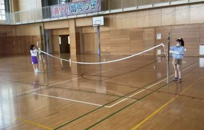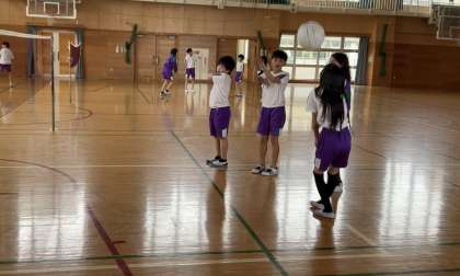 5年生の体育は「ソフトバレーボール」です。今日は、ルールを覚えるために、団で向かい合って練習しました。振り返りで「Aさんはレシーブがとても上手だし、みんなに声かけをしてチームを盛り上げていた。自分も真似をしたい。」「打ち方が分からない人にレシーブの仕方を教えてあげられた。その人ができるようになって嬉しかった。」などの意見がでました。自分や仲間の心や体をよりよくしようと、認め合い、補い合い、励まし合って体育の学習を進める姿がすてきでした。