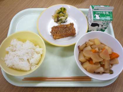 本日の献立は、ごはん、牛乳、揚げ出し豆腐のごまだれかけ、昆布和え、いかと野菜の煮物です。