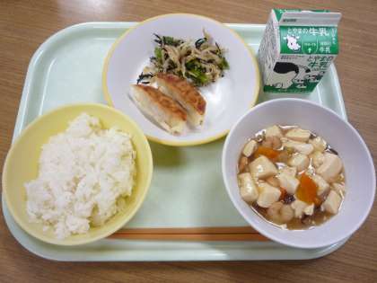 本日の献立は、ごはん、牛乳、焼き餃子、小松菜とひじきのナムル、えびと豆腐のうま煮です。