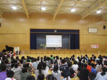 1年生の入学をお祝いする、全校集会がありました。6年生を中心に、楽しいクイズや合唱で盛り上がりました。