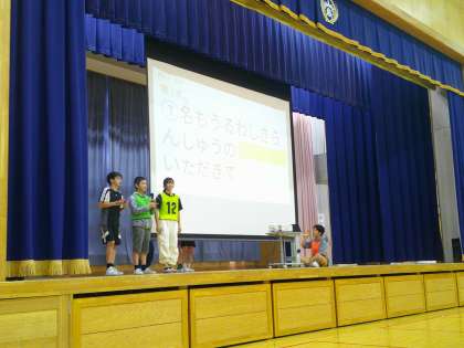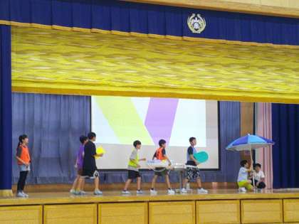 楽しい間違い探しゲームや、1年生を知ることができるクイズ、歌のプレゼントで1年生の入学を祝福しました。子どもたちの笑顔があふれる集会になりました。