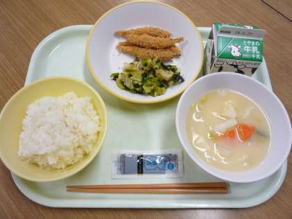 本日の給食は、ごはん、牛乳、きびなごのさくさく揚げ、ごまびたし、呉汁、のり佃煮でした。