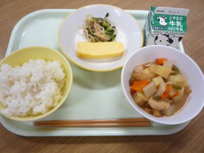 本日の給食は、ごはん、牛乳、厚焼き卵、小松菜ごま和え、関東だきでした。