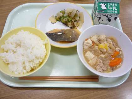 本日の給食は、ごはん、牛乳、ふくらぎの西京焼き、昆布和え、肉豆腐でした。