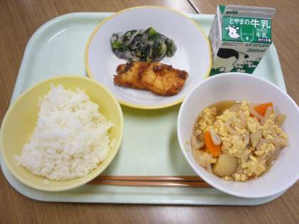 本日の給食は、ごはん、牛乳、魚の竜田揚げ、よごし、卵とじでした。
