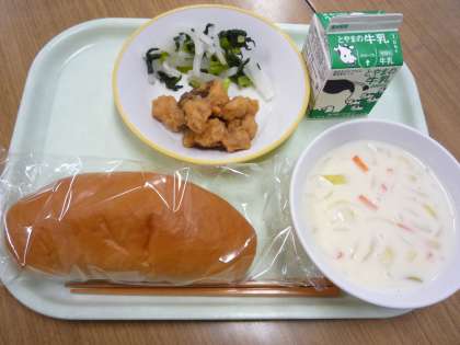 本日の給食は、米粉コッペパン、牛乳、鶏肉とレバーのりんごソースからめ、大根サラダ、ビーンズポタージュでした。