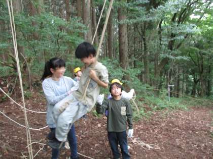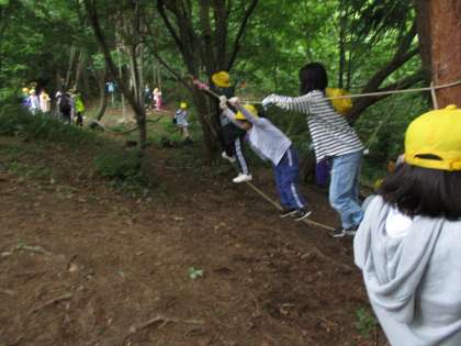 木にロープを張って遊具を作る「ワイルド遊び」、夜の自然を探索する「ナイトハイク」を行いました。
