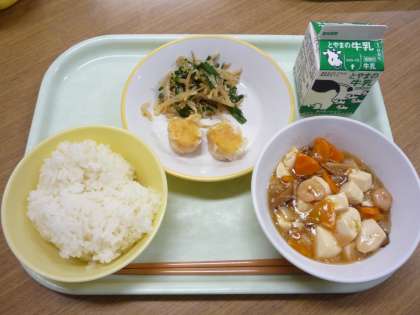 本日の献立は、ごはん、牛乳、にんじんシューマイ、ナムル、えびと豆腐のうま煮でした。
