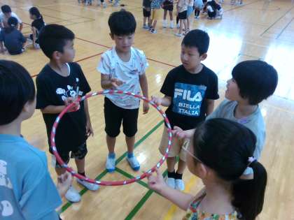 フラフープなどを使った体あそびをしました。グループで力を合わせて楽しみました。