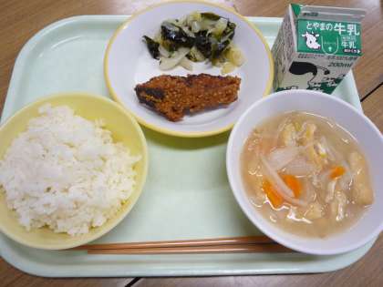 本日の献立は、ごはん、牛乳、魚の利久揚げ、酢の物、みそ汁でした。