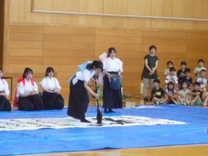 袴姿でリズムよく大きな文字を書く姿を、子供たちは顔を輝かせて見ていました。