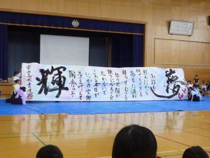 今日は、富山高校の書道部の方が来校し、全校児童に「書道パフォーマンス」を見せてくださいました。