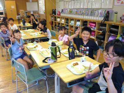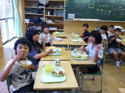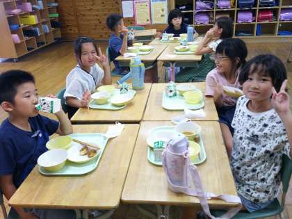 一ヶ月ぶりの給食です。班になって、楽しそうに食べる子どもたち。感謝の心で、美味しくいただきました。