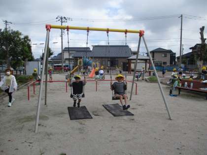 2回目の町探検に行きました。1.2組はあきよし公園、3.4組はこびと公園に町探検に行きました。公園では楽しく遊んだり、すてきを見つけたりしました。