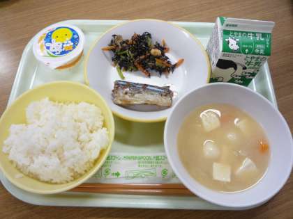 本日の献立は、ごはん、牛乳、さんまの生姜味、大豆とひじきのごま和え、団子汁、お月見ゼリーでした。