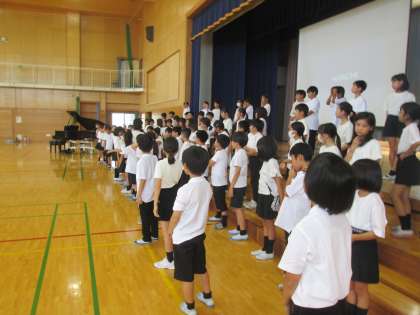 連合音楽会に向けて子供たちは、合唱の練習に取り組んでいます。写真は、実際の衣装を着て練習している様子です。歌やダンスに挑戦し、悩んだり失敗しながらも成長しています。本番までにどのくらい成長できるのかとても楽しみです。