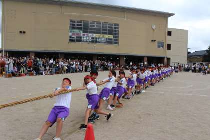 中学年団体競技「心を一つに!一致団結綱引き」の赤団対白団(優勝決定戦)と、徒競走80m走の様子です。