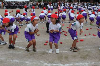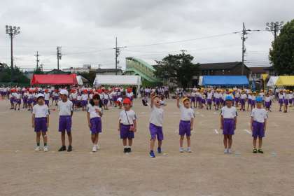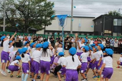 音楽に合わせて楽しく踊ったり、かごを目がけて玉を投げたりしました。笑顔がとてもすてきな子供たちでした。