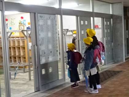 今日は肌寒い朝でしたが、子供たちは元気に登校してきました。クラス替えがあった学年の子供たちは、玄関前で自分のクラスを確認して校舎に入っていきました。