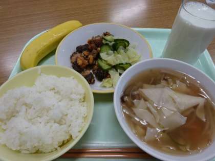 ご飯、牛乳、ワンタンスープ、きざみ和え、魚と大豆のえごまみそからめ、バナナでした。一年生にとっては、小学校で初めての給食でした。