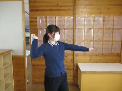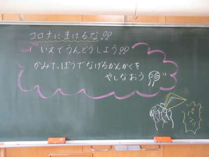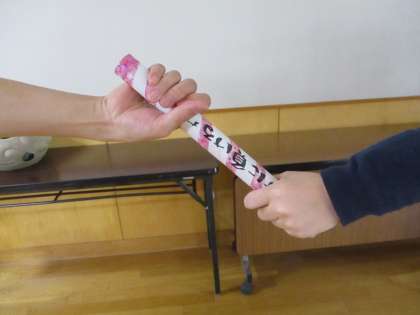 先生たちは、紙鉄砲を紹介します。紙鉄砲を行うことによって、投げる感覚を養うことができます。よい音が出れば、腕のふりなどがしっかりできています。先生たちは、よい音がでるか5回勝負をしました。誰が勝ったかは、学校に来たときに聞いてください。とてもよい運動になったので家で行ってみてください。