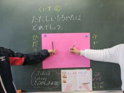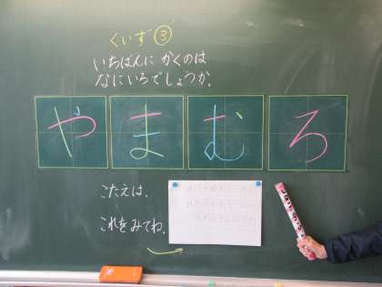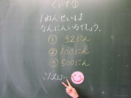 1ねんせいのみなさん、げんきにすごしていますか?2ねんせいからばとんをもらいました。せんせいたちからのがっこうくいずです!こたえにまよったら、きょうかしょでしらべてもいいですよ。3もん、ぜんぶせいかいできるかな・・・?!みなさんにあえるのをたのしみにまっています。