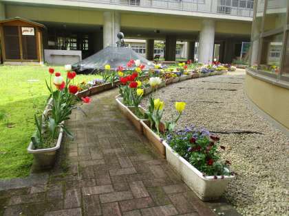 中庭のプランターのパンジー、チューリップがきれいに咲き誇っています。中庭に立ってきれいな花々を見ていると、心が落ち着きます。すくすくと育つ花々のように、私たちも1日1日を元気いっぱいに過ごしていきたいものです。