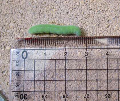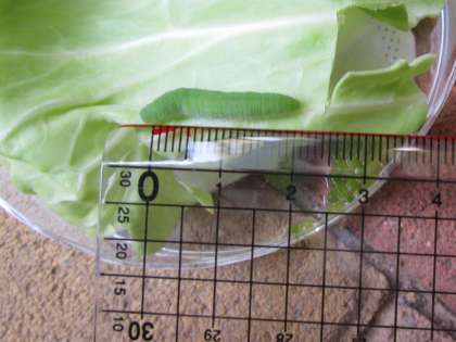 昨日とは別のモンシロチョウのよう虫をかんさつしたよ。2ひきとも3cmくらいでとっても大きかったよ。キャベツのはをいっぱい食べて、みどり色のふんをしているね。早くせい長してさなぎになるすがたを見てみたいな。